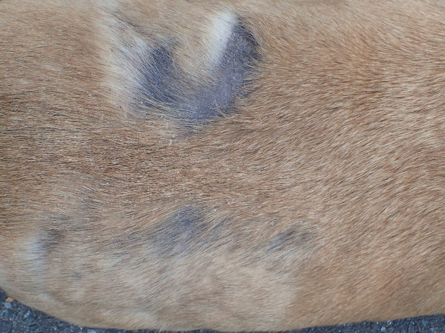 右腰部の皮膚が大きく脱毛し痒がっている。痂皮(++)、色素沈着(++)